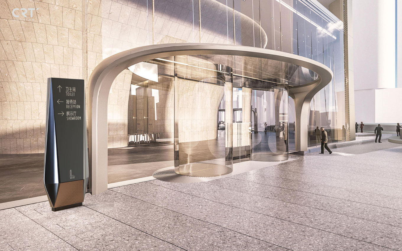 未來流動性的外立面設計,在售樓部標識設計中,也延伸了視感流動性的外立面特點,把杭州望朝中心導視設計用現代科技的曲線形式進行構思,以切面的造型,加上金屬的品質感覺。在杭州2022年亞運會的主辦城市,借勢實現品牌文化的傳播,以國際化的視覺去呈現,人和時代CRT杭州標識設計公司以超前視覺感覺、以建筑曲線作為靈感覺,不銹鋼疊片組成企業元素圖形,滲透著光影掠過天際,漸消面園弧切線,外星科技感覺流線造型。
